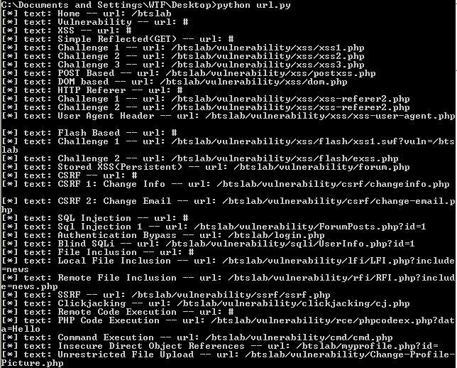 print "[*] text: %s -- url: %s " %(link.text,link.url)